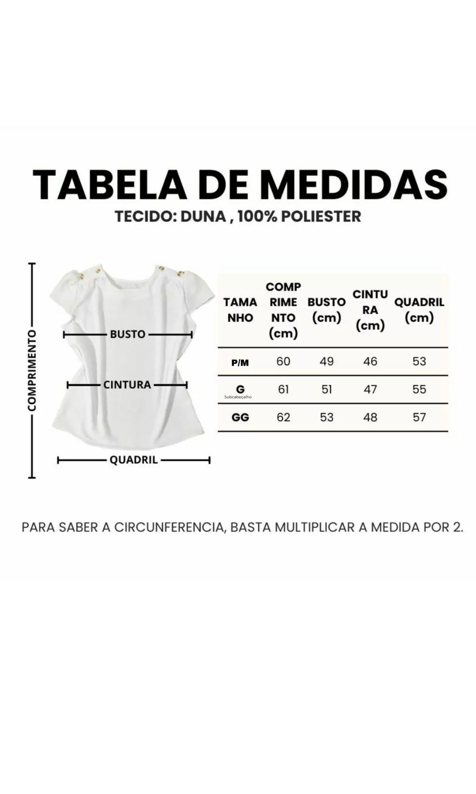 Tamanho GG– Busto: 43cm, Cintura 48cm, Comprimento:62